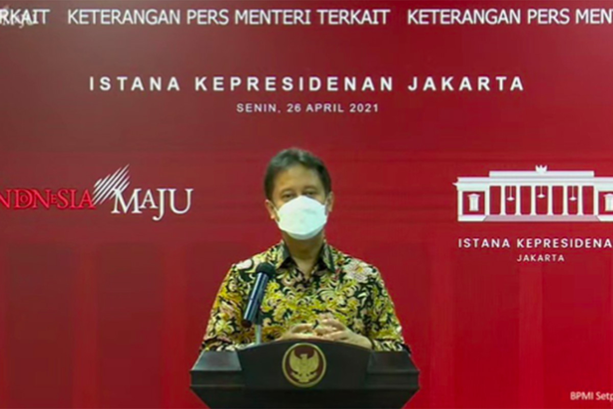Menteri Kesehatan Budi Gunadi Sadikin pada keterangan pers setelah rapat terbatas di Kantor Presiden, Senin (26/4). Foto: Tangkapan Layar Youtube Sekretariat Presiden